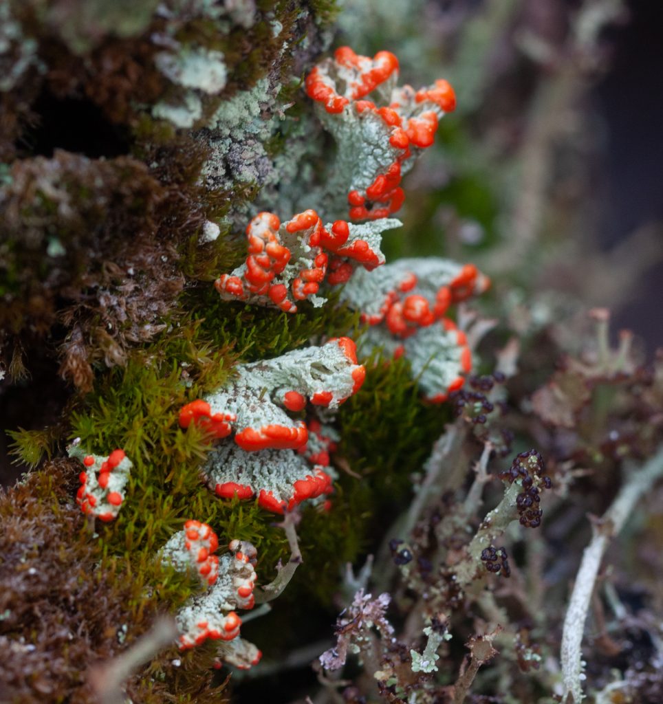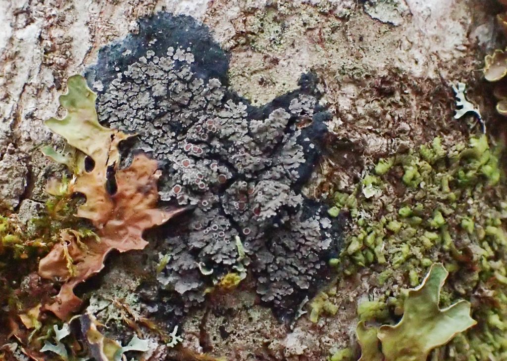 Gritty British Soldier Lichen – Cladonia floerkeana, Blue Felt Lichen – Degelia plumbea, Black Foam Lichen – Anzia colpodes
